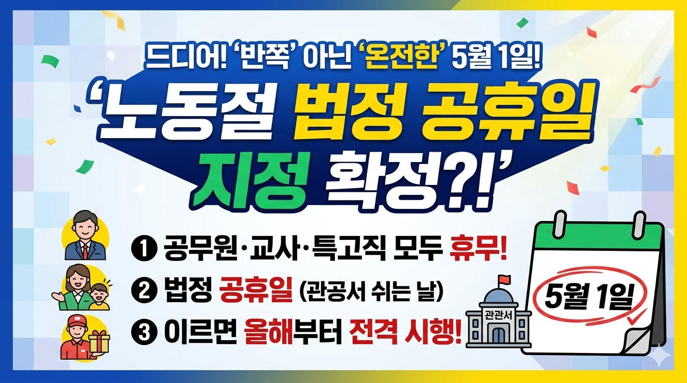 2026년 3월 24일, 대한민국 노동 역사에 한 획을 그을만한 중요한 소식이 전해졌습니다. 국회 행정안전위원회 법안심사제1소위원회에서 5월 1일 노동절을 정식 '법정 공휴일'로 지정하는 '공휴일에 관한 법률(공휴일법)' 개정안이 의결된 것입니다. 그동안 '반쪽짜리 휴일'이라 불리며 공무원, 교사, 그리고 특수고용직 종사자들에게는 그림의 떡이었던 노동절이 이제 모든 국민이 함께 쉬는 온전한 휴일로 거듭날 준비를 마쳤습니다.